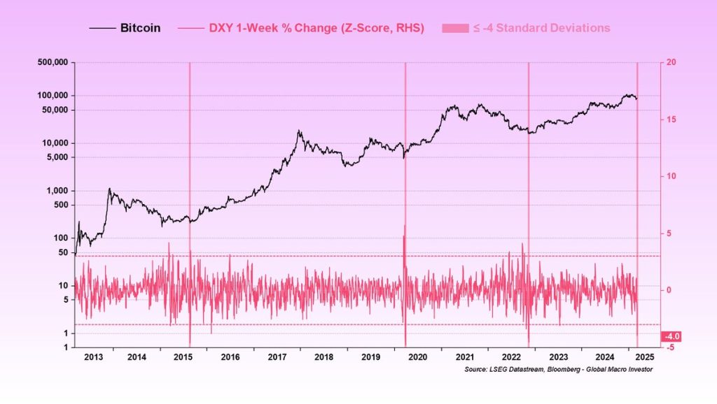Tako veliki padci DXY so se zgodili le trikrat v zadnjih 12 letih, pri čemer je Bitcoin v vseh primerih nato močno zrastel.