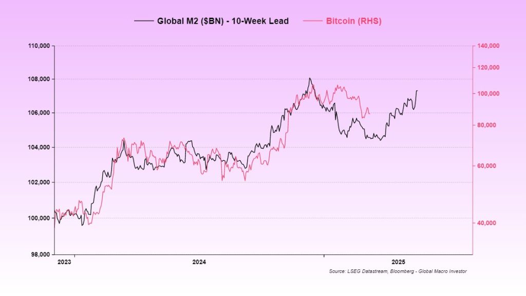 V preteklosti smo beležili močno korelacijo med količino denarja v obtoku M2 in ceno Bitcoina.