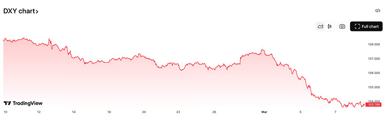V začetku marca smo opazili padec vrednosti indeksa DXY, ki meri moč oziroma vrednost ameriškega dolarja v primerjavi s košarico šestih drugih valut.