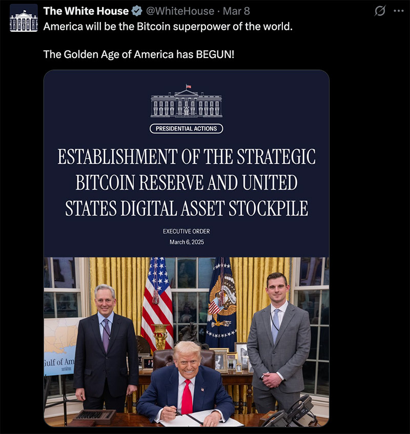Predsednik ZDA Donald Trump je 6. marca 2025 podpisal izvršni ukaz o vzpostavitvi strateške rezerve Bitcoina in zaloge digitalnih sredstev. Ta poteza je del prizadevanj ZDA, da postanejo vodilna sila na področju digitalnih valut, kar kaže na naraščajoče priznavanje digitalnih sredstev v tradicionalnih finančnih in vladnih krogih.